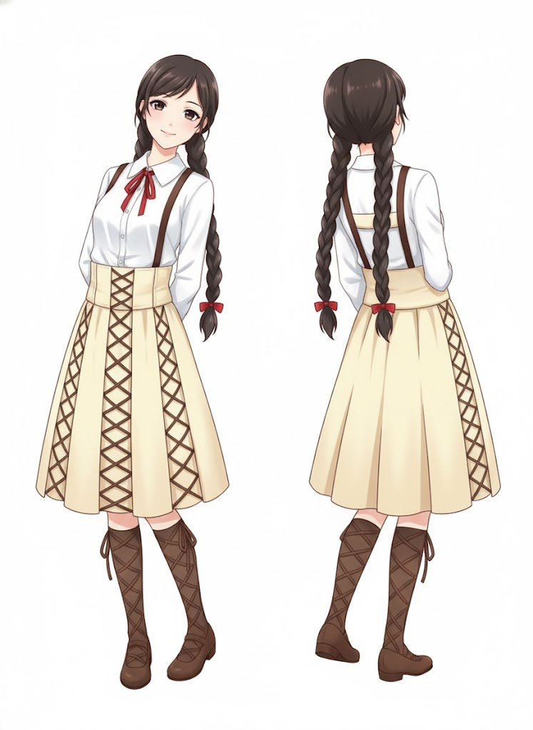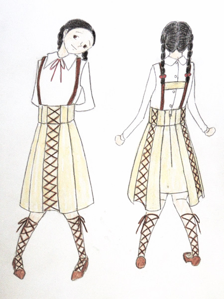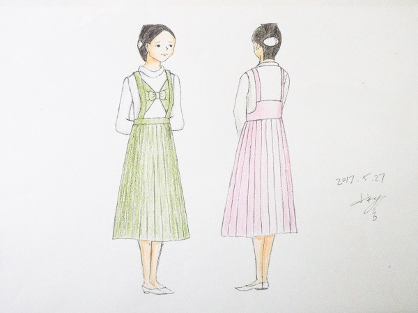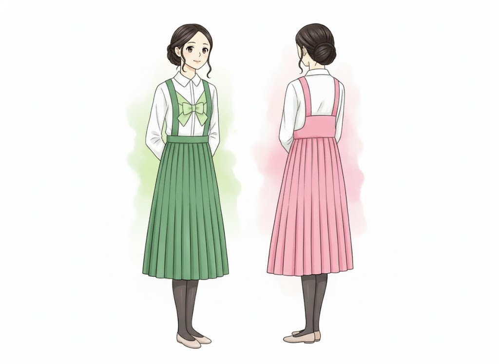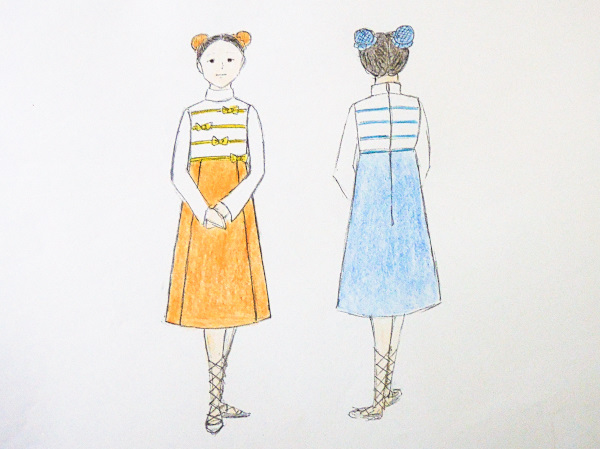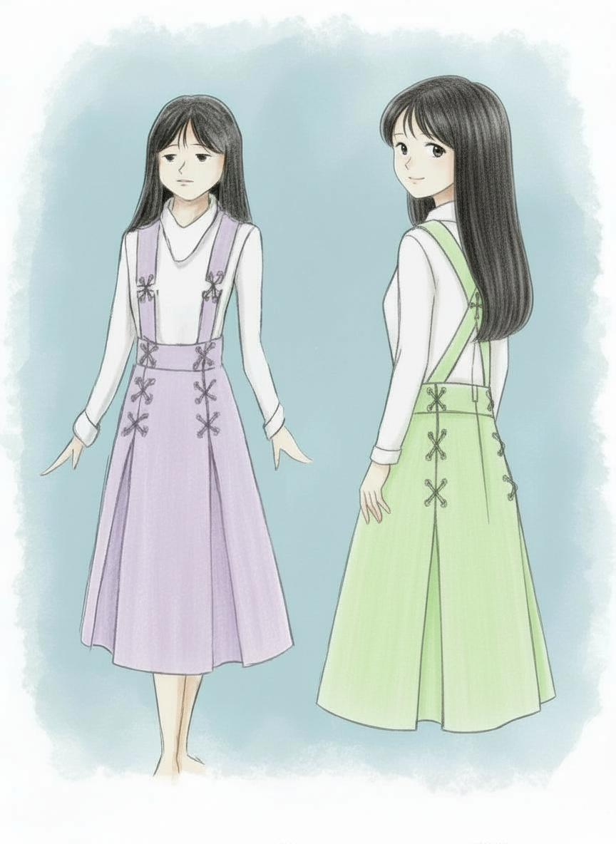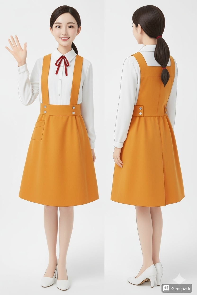 - 前と後ろでイメージが変化するワンピース風サスペンダースカート