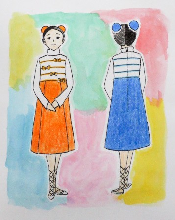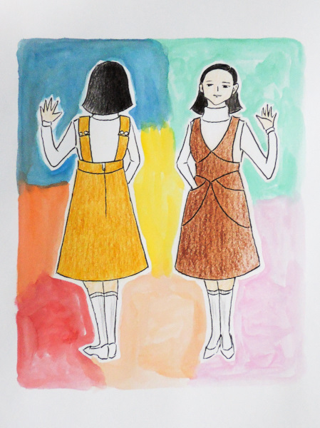 - マタニティドレスのアイデア。フリルで胸を出す部分を隠している。