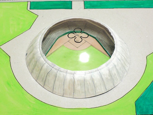 - ミズクラゲの傘の形をしたドーム球場。模型では屋根が透明だが、本来は白。