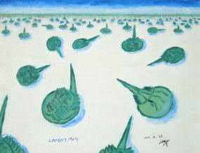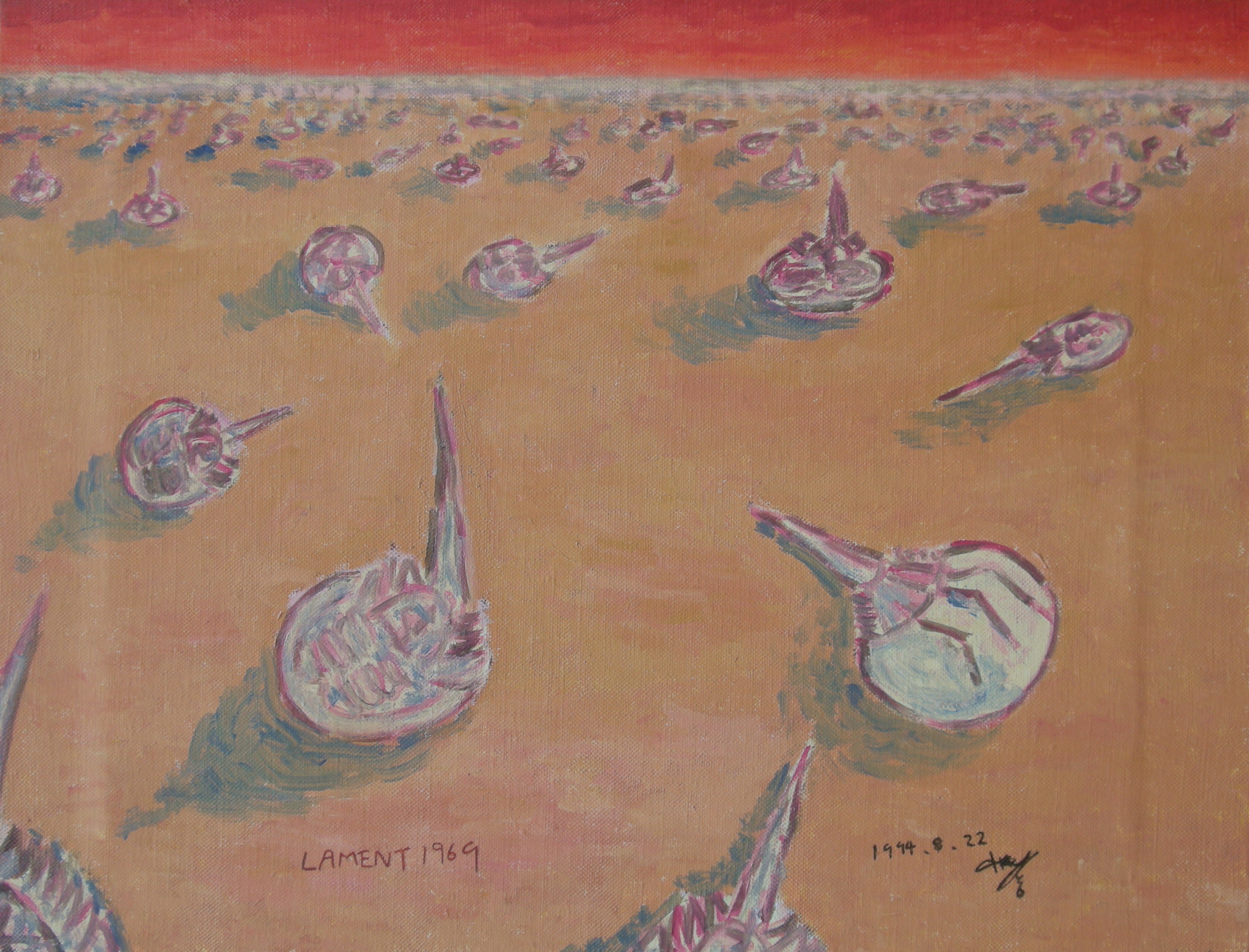 モチーフは1969年に始まった笠岡湾埋め立て工事の影響で日干しになるカブトガニ。