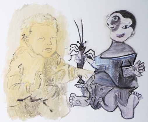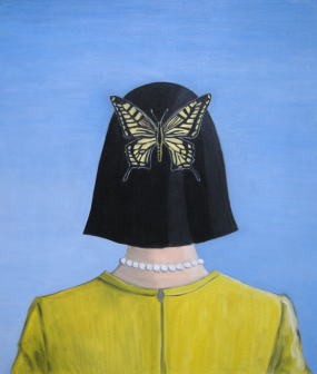 議員バッジからモデルは政治家とわかる。だが、キャンバスに描かれていのはゴキブリである。